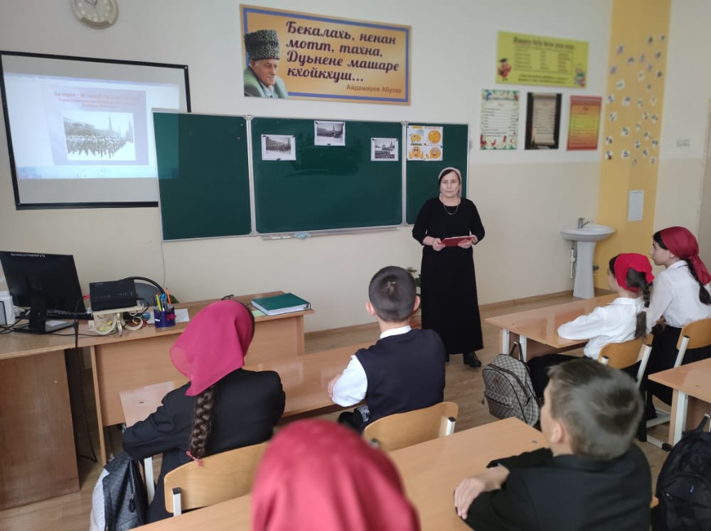 07.11.2022В целях воспитания в детях гордости за свой народ, чувства благодарности к участникам ВОВ; сохранения памяти о событиях того времени, которые явились значимыми для всего народа в МБОУ "СОШ № 10 г. Урус-Мартан" проведён классный час на тему: " Парад, изменивший историю. 7 ноября 1941 года'. В ходе классного часа были рассмотрены следующие вопросы: