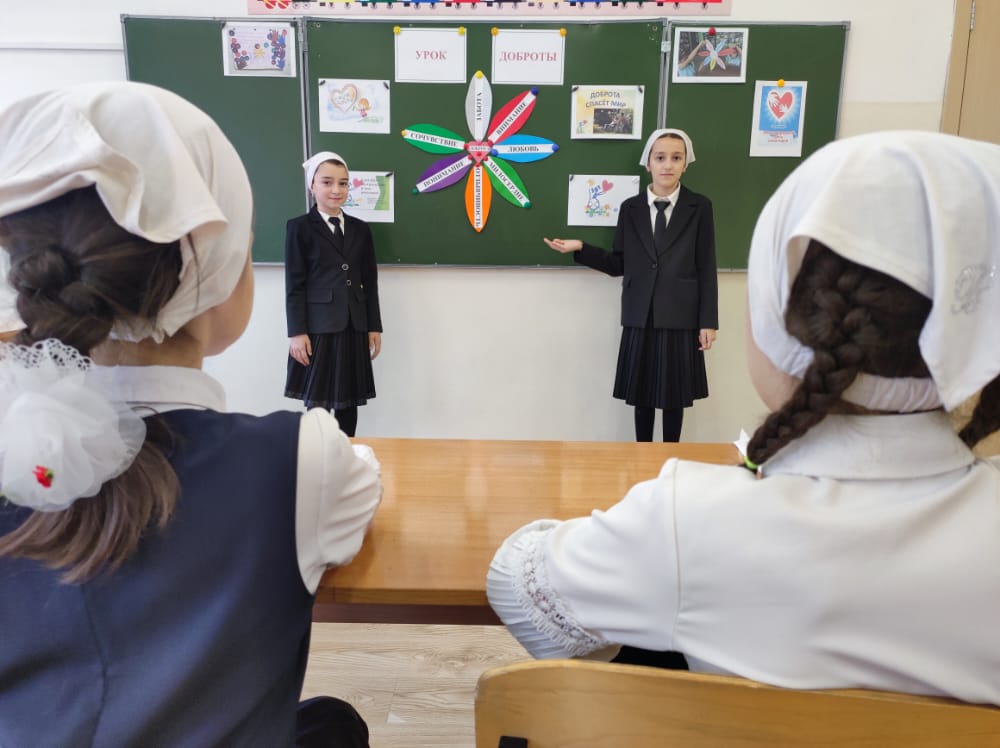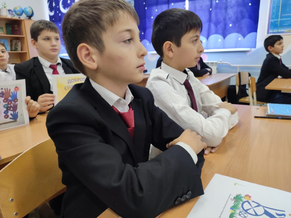 Дети внимательно слушали рассказ своих классных руководителей и сами рассказывали истории о доброте и человечности людей. Учащиеся вспоминали свои добрые дела к родителям, бабушкам, дедушкам, учителям, сверстникам.