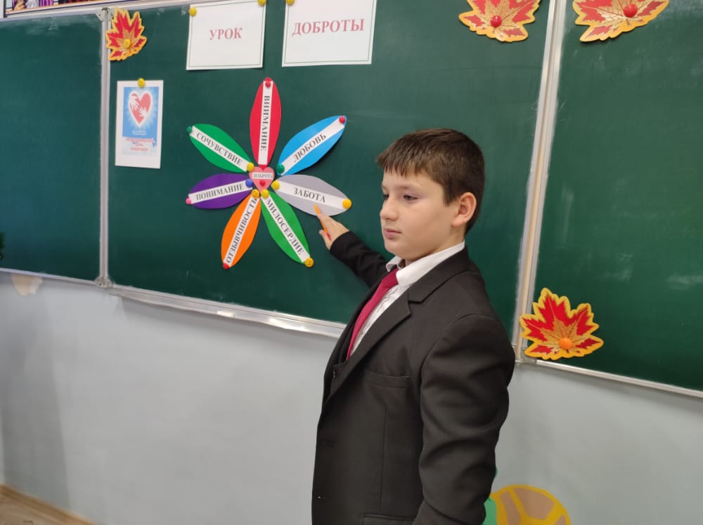 В начальных классах были проведены беседы «Что такое добро?» На примерах детям было рассказано, какой смысл люди вкладывают в понятие «добро», «зло», о том, что доброта делает нас отзывчивыми и терпимыми, способными дарить окружающим заботу и любовь. На лепестках «Цветка доброты» ребята записали свои пожелания доброты и как они могут помочь и поддержать детей с ограниченными возможностями здоровья.