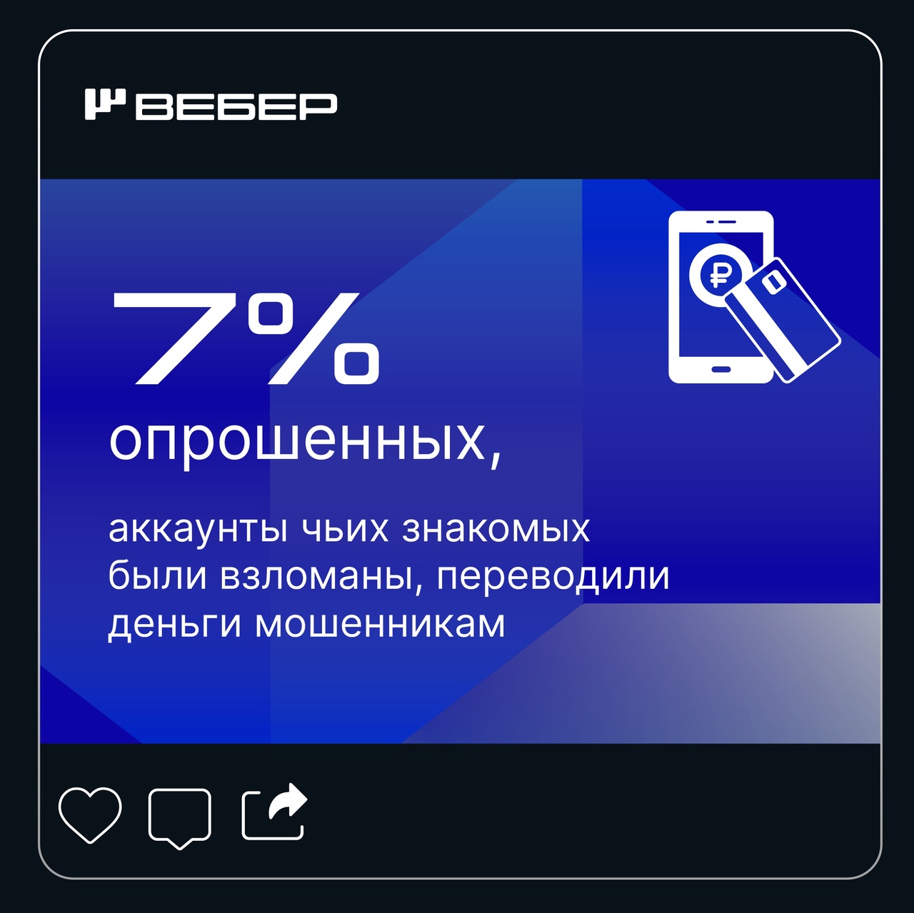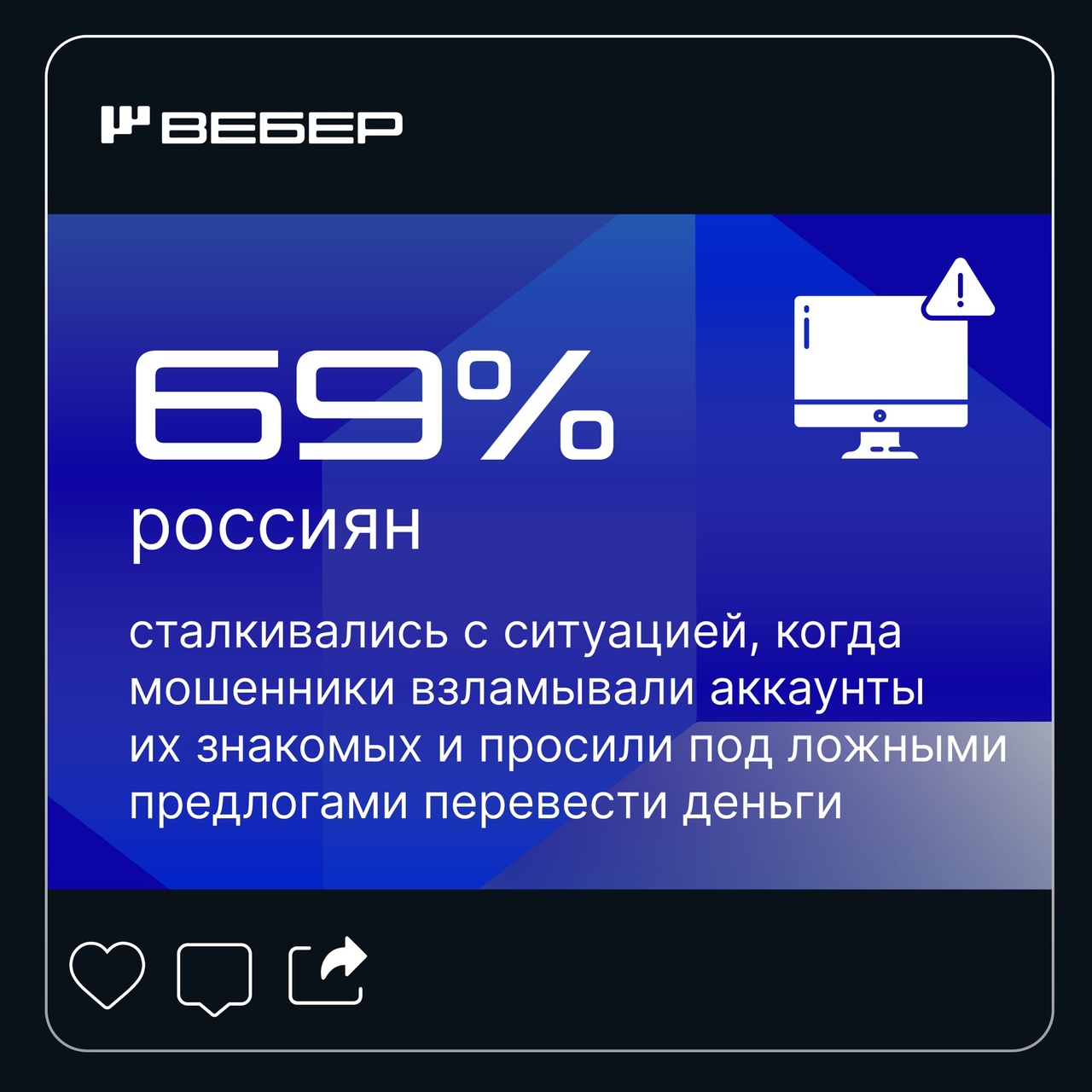 Соцагентство «Вебер» проанализировало мнение россиян о безопасности в сети. 69% жителей страны сталкивались с ситуацией, когда мошенники взламывали аккаунты их знакомых и просили под ложными предлогами перевести деньги. А переводили мошенникам свои деньги 7% респондентов.