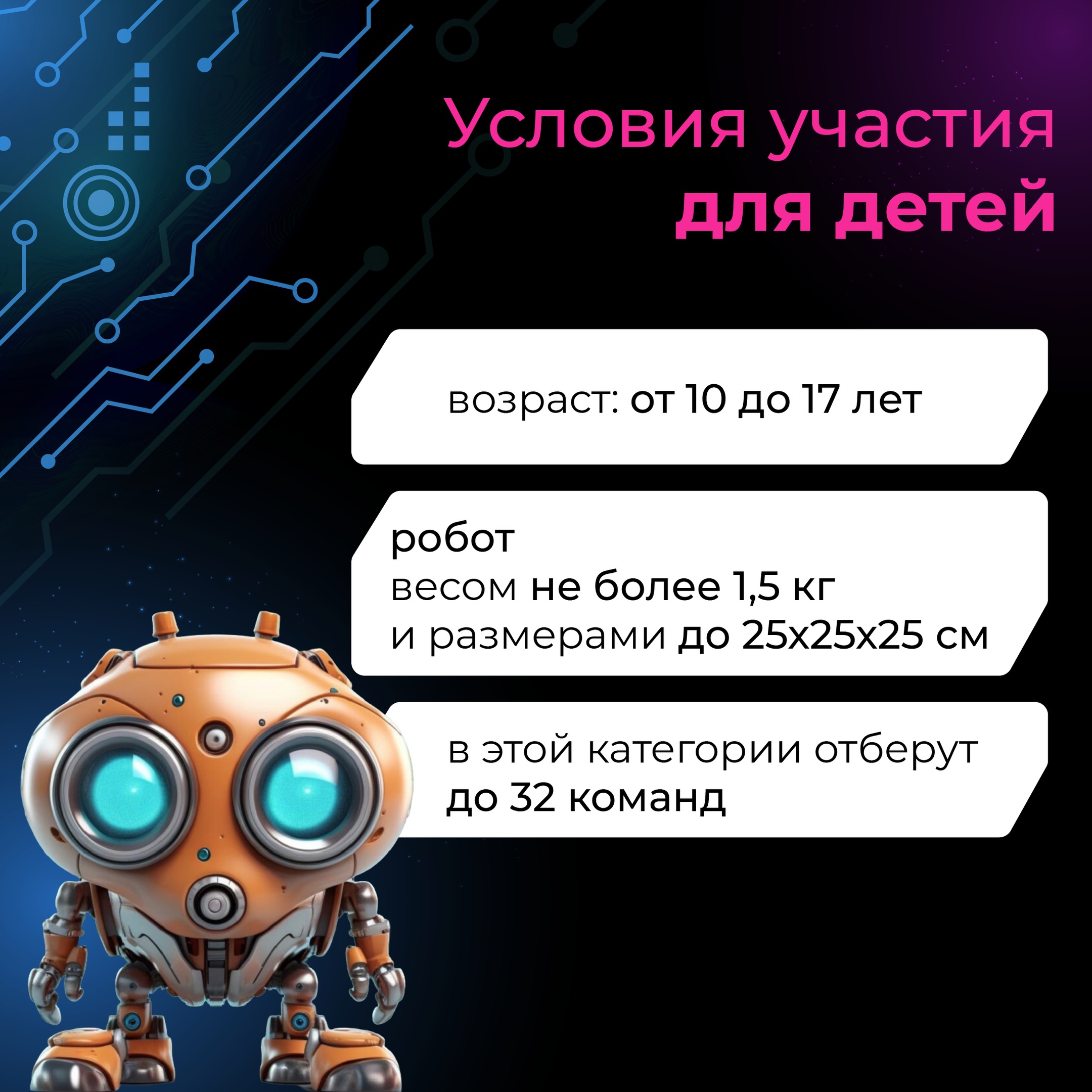 Твоя задача: сконструировать робота в соответствии с требованиями категории, ведь от него зависит твоя победа. После этого управляй им и демонстрируй свои технические навыки в поединках!