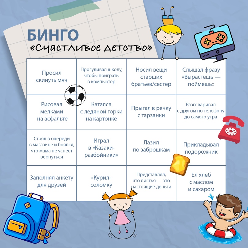 01.06.2024День защиты детей — один из самых добрых праздников, который не обходится без веселых мероприятий, озорного смеха и веселья. По такому случаю мы предлагаем вспомнить беззаботные времена и сыграть в бинго — пишите в комментариях, с какими из этих случаев вы сталкивались в детстве