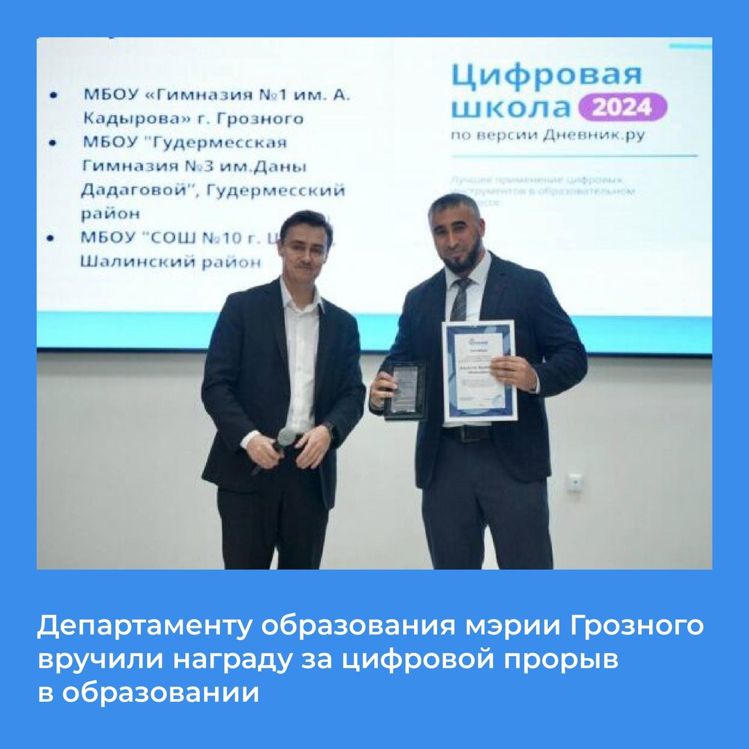 01.11.2024Заместитель директора по развитию ООО «Дневник.ру» Сергей Издебский вручил награду «Цифровой прорыв года» заместителю мэра - начальнику столичного департамента образования Зелимхану Ахматову. Он подчеркнул, что Грозный является лучшим муниципалитетом страны по использованию цифровых инструментов в образовательном процессе.Кроме того, МБОУ «Гимназия № 1 им. А.А. Кадырова» была удостоена звания «Самая цифровая школа 2024 года» за успешное применение цифровых технологий в образовательной деятельности.Мэр Грозного Хас-Магомед Кадыров поздравил всю систему столичного образования и отметил важность внедрения электронного журнала.