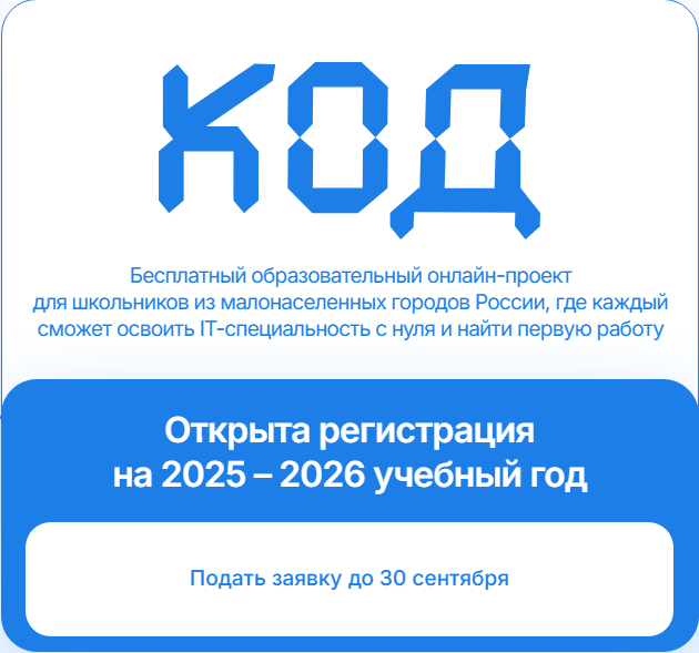 27.08.2025Уже пятый год Фондом реализуется бесплатный образовательныйонлайн-проект «КОД», в котором принимают участие подростки в возрасте от 14до 17 лет (учащиеся 8-11 классов и 1-2 курсов колледжей) из отдаленныхрегионов России, проживающие в малонаселенных городах, сёлах и посёлкахгородского типа численностью до 100 000 жителей.Проект развивает у подростков профессиональную ориентацию поосновным аспектам информационных технологий. Он призван заинтересоватьдетей 1Т-индустрией и помочь им определиться с профессией в этой области.Обучение в проекте идет по трем направлениям: Backend-разработка,Frontend-разработка и иХ/Ш-дизайн. По итогам учебного года лучшиеучастники приглашаются на недельную Стажировку в Санкт-Петербург. В 2025году с 11 по 17 мая в ней принял участие 51 лучший ученик.За время работы проект охватил все регионы России. На сегодняшний деньна проекте прошли обучение более 2300 учащихся.Проект «КОД» открыл набор на новый 2025-2026 учебный год. Заявки научастие в проекте «КОД» принимаются через группу проекта ВКонтакте https://vk.com/kodprog