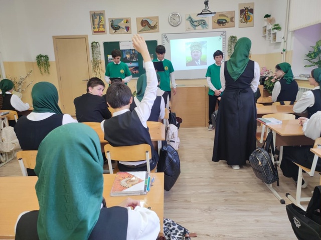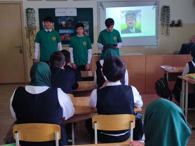ЧРОО ЕДЮО "Юные Кадыровцы" организовали и провели в 8А классе классный час на тему: "Жизнь и деятельность первого Президента Чеченской Республики, Героя России А-Х. Кадырова".